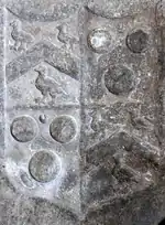 • Firstly to Catherine Courtenay (1632-1671), a daughter of John Courtenay (d.1661) of Molland in North Devon, descended from Sir Philip Courtenay (died 1488) of Molland, the second son of Sir Philip Courtenay (1404-1463) of Powderham by his wife Elizabeth Hungerford.[34] Her ledger stone survives in St Matthew's Church, Cheriton Fitzpaine, in the south aisle, in an identical style to that of her mother-in-law. It displays the arms of Moore impaling Courtenay of Molland (Or, three torteaux a label of three points azure each point charged with three plates[35]) and is inscribed as follows: