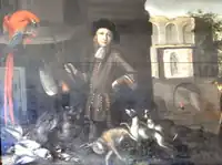 Detail of 18th century oil on panel overmantel in Upcott Barton depicting a sporting country gentleman, with a capriccio scene