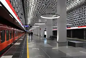 Urheilupuisto is unique among metro stations in Espoo, as it is not built into the bedrock.[5] The station platform is located at a depth of about 27 meters below street level. Urheilupuisto station was designed to operate with only one entrance (on the western side of the building) but, in response to passenger feedback, an entrance was constructed in the eastern side and opened on 29 February 2020.[6] The station is located 1,1 kilometres east from Niittykumpu metro station and 1,3 kilometres west from Tapiola metro station.