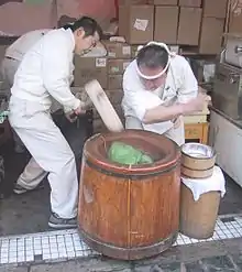An usu (Japanese: [ɯꜜsɯ], Japanese: )[1] is a large Japanese stamp mill with a pestle called kine ([kiꜜne], Japanese: ), used to pound rice or millet.
