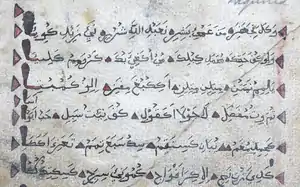 The oldest manuscript of the epic is dated 1141 Anno Hegirae, corresponding to 1728 CE. It was written at Yunga, a royal palace in the old city of Pate (the palace has since been destroyed). In strophe 1124–1125, the author notes that the "king of Yung"' (that is, the then Sultan of Pate) asked him to write an epic on the heroic deeds of the first followers of the Islamic prophet Muhammad. The author identifies himself in one of the final stanzas (1146) as Mwengo, son of Athumani (Uthman). Not much more is known about him other than that he wrote at the court of the Sultan of Pate, that he was no longer a young man by 1728, and that some other poems are ascribed to him.[3] He also had a son, Abu Bakr bin Mwengo, who wrote an imitation of his father's epic somewhere in the middle of the 18th century.[4]