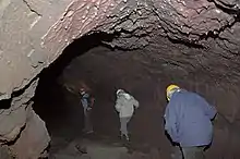 Víðgelmir (Icelandic pronunciation: [ˈviðˌcɛlmɪr̥]) is a lava tube situated in the Hallmundarhraun lava field (formed around 900 AD) in west Iceland, around 2 km southeast of Fljótstunga[1] farm in Hvítársíða, Borgarfjörður. The roof of the lava tube has collapsed, creating two large openings near its north end which are the only known entrances. Víðgelmir is 1585 m long and the largest part of the cave passage is 15.8 m high and 16.5 m wide, making it by far the largest of its kind in Iceland. The cave has a wide entrance but narrows down in some places. An iron gate was installed at the first constriction in 1991 to preserve those of the delicate lava formations or speleothems which hadn't already been destroyed. Evidence of human habitation, probably dating to the Viking Age, has been discovered in the cave and is preserved in the National Museum of Iceland. Long stretches of the cave floor are very rough and shouldn't be navigated without a guide. Access and guided tours are provided at nearby Fljótstunga.
