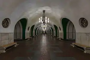 Originally, this station was planned to be opulently decorated in the manner of the other stations built in the 1950s, with mosaics by venerable artist Vladimir Favorsky along the insides of the arches between the pylons. However, in the wake of Nikita Khrushchev's attack on decorative "excessions", the place for mosaics, including existing mosaics as well, were crudely coated with incongruous thick green paint.
