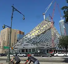 VIA 57 West (marketed as VIΛ 57WEST) is a residential building located at 625 West 57th Street between 11th and 12th Avenues in Hell's Kitchen, Manhattan, New York City. The pyramid shaped tower block or "tetrahedron", designed by the Danish architecture firm Bjarke Ingels Group (BIG), rises 467 ft (142 m) and is 35-stories tall.[4]