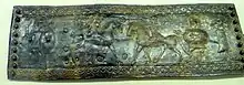 The belt-plate dates to the 5th century BC and is displayed at the Vienna Natural History Museum. It is 28.5 cm long and depicts five figures, four of which are warriors in combat. Two of the central warriors are on horseback.[1] These may be depictions of mythological events.[2]