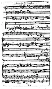 The ritornello for horn obbligato at the outset (bars 1 to 9) prefigures the melody sung by Caesar. The horn subsequently also echoes Caesar every time the word "cacciator" (hunter) is sung.[6] As pointed out by Richard Taruskin, the use of a natural instrument such as the horn "sets ... narrow limits on the harmony, virtually confining it to ... the "primary" chords – tonic, dominant, subdominant",[7] and this is reflected in the harmony and orchestration of the aria. The opening and closing sections are in F major; the central section (in which the horn is silent) is in D minor with a modulation to A minor.[8][1]