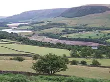 Valehouse (or Vale House) Reservoir is a man-made lake in Longdendale in north Derbyshire, England. It was built between 1865 and 1869 as part of the Longdendale Chain of reservoirs, which was built to supply water from the River Etherow to the urban areas of Greater Manchester, while maintaining a constant flow into the river.[1] The upper reservoirs supply the drinking water, while Vale House and Bottoms are compensation reservoirs which guarantee the flow of water to water-powered mills downstream.[2] Valehouse, with a crest elevation of 503 metres (1,650 ft), is too low to supply water under gravity to the Mottram Tunnel, so could not be used as an impounding reservoir. Today 45 megalitres of compensation water are released each day into the River Etherow.[3]