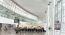 Valencia Airport consists of a single terminal that has been built in three stages which are directly connected to each other. The landside hall consists of three check-in areas: 1-12 is the newest one with the airport station beneath it, 13-42 is the oldest main building with a currently derelict upper floor, 43-56 is the largest annex housing most airlines. A single central security area leads to the airside with gates 1-22, with gates 1-4 being the newest area designated for non-Schengen flights. Gates 12-22 are located in a separate hall designated as a regional terminal that opened in time for the 2007 America's Cup which allows walk-boarding, mainly for flights by Iberia Regional and low-cost carriers. Some of the gates are equipped with jet bridges. The airside area features several food outlets and shops.
