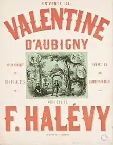 Valentine d'Aubigny is an opéra comique in three acts composed by Fromental Halévy to a libretto by Jules Barbier and Michel Carré. It premiered in Paris on 26 April 1856 at the Théâtre de l'Opéra-Comique (2° Salle Favart). The comic story is set in Fontainebleau and Paris at the beginning of the 18th century and revolves around mistaken identities and the machinations of the Chevalier de Boisrobert and Sylvia, an actress at the Théâtre-Italien, who try but ultimately fail to prevent the marriage of Gilbert de Mauléon and Valentine d'Aubigny.[1][2]