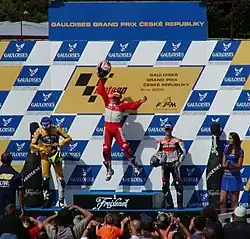 At the 1996 Austrian Grand Prix, Rossi scored his first ever podium in the form of a third place after battling with Jorge Martínez.[20][21] At the following race, which was the 1996 Czech Republic Grand Prix, he scored his first ever pole position on Saturday and his first ever race victory in the 125cc class on an AGV Aprilia RS125R on Sunday, after fighting with Jorge Martínez.[22]