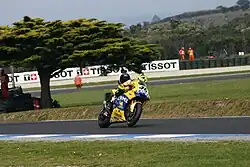 Rossi scored three pole positions in the next three races and finished second in France after battling with Gibernau, who overtook him on the last lap.[68][69] He won in Italy and came second again in Catalunya.[70][71] He took two third-place finishes at the Dutch and British rounds – the latter the result of a ten-second penalty for overtaking under yellow flags, gifting victory to Max Biaggi in the process – and another second place in Germany, once again battling Gibernau who denied him victory with just 0.060 seconds separating both when they crossed the finish line after a titanic battle between the two.[72][73][74]