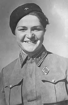 Valeria Dmitrievna Khomyakova (Russian: Валерия Дмитриевна Хомякова; 3 August 1914 – 6 October 1942) was a Soviet fighter pilot and military officer during World War II. She was widely reported as the first woman pilot to shoot down an enemy aircraft, but later changed to the first in a night battle. Khomyakova was awarded the Order of the Red Banner, but was killed in a flight accident only two weeks later.