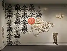 Taking Place is a 2,700 sq. ft. painting installation that reimagines some of the Peabody Essex Museum's most beloved objects from their global collections.[3] Platacis' research-based art practice resulted in 210 stencils, all drawn and cut by hand. Organic forms and curvilinear lines emerge as dominant elements across generations and cultures as her labor-intensive contemporary approach to painting connects to the skill and artistry embedded within the historic objects of PEM's collection. The exhibition opened September 2019 and all 210 stencils have been acquired by PEM for the museum's permanent collection.