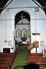 The church has a rectangular nave measuring about 18 by 13 metres (59 ft × 43 ft) and a smaller, narrower choir measuring about 10.4 by 9.6 metres (34 ft × 31 ft). It does not have a sacristy, porch, or tower. The stone walls of the church are all 6 metres (20 ft) high and are also about 1.3 to 1.6 metres (4 ft 3 in to 5 ft 3 in) thick. The ceiling of the church reaches 18 metres (59 ft) high at the highest point. The church has a hexagonal pulpit from the early 17th century. It is decorated with painted tulips, brass ornaments, and pilasters in green, yellow and red against a pale yellow background.[4][3][5]