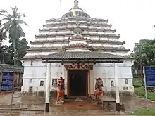 The icon of Shveta Varaha, the white incarnation of Varaha, is the principal deity of the temple.[5] The temple faces east and is located in a 30-by-40-metre (98 by 131 ft) plot. The temple structure is built over a plinth of 25.30-by-12-metre (83.0 by 39.4 ft). The height of the temple is 22 metres (72 ft). Built in Kalinga architectural style, the temple has three components, namely the vimana (building containing the sanctum), the antarala (a small chamber between the sanctum and the hall) and the jagamohana (assembly hall). The vimana is a Rekha deula (a tall building with a shape of sugar loaf) and the jagamohana is a pidha deula (square building with a pyramid-shaped roof). The Vimana as well as the jagamohana are square in shape. The temple is built in ashlar masonry with Khandolite stone, the exposed surfaces are plastered and given a white wash of lime. The outer wall is panchanga bada, that is, divided into 5 parts (from base to top): pabhaga, talajangha, bandhana, upara jangha and baranda.[1]