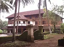 The Varikkasseri family is reported to have a history of over 1000 years and the family is known to have occupied a sovereign position among Ashta gruha (Eight Families) Namboothiri families.[1] The Mana was built by Varikkassery Ravi Namboothirippad[2] in or about 1902, using locally available red stone.[3] An expansive padippura (gate house)[4] provides the entry to the three-storied building complex which comprises a nalukettu with 74 rooms, two pathayappuras (outhouses), a large pond and the adjoining bath house, a family temple complex consisting three temples of Shiva, Krishna and Ayyappan, and an oottupura (dining hall), which has since been demolished.[5] It was designed by Krishnan Thampuran, also known as Shilpi Thampuran, of Varikkasseri family, who had earlier studied architecture in Chennai and his exposure to western architecture is seen in the design of the building, especially in the long slender columns surrounding the portico of the building. The beams, doors and windows are made out of wood and are adorned with intricate carvings.[3]