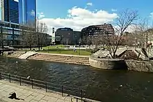 Vaterland Park with Oslo Plaza and Postgirbygget to the left and Akerselva in the foreground