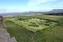 The campsite in Ásbyrgi. Vatnajökull National Park's visitor centre, Gljúfrastofa [ˈklju(v)raˌstɔːva], can be seen further away.