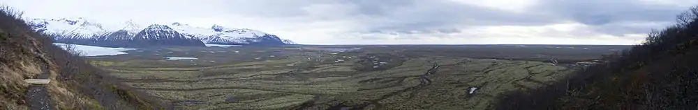 The south side of Vatnajökull is characterised by many high, majestic mountain ridges, with outlet glaciers descending between them onto the lowlands. The southernmost part of the glacier envelops the central volcano Öræfajökull and Iceland's highest peak, Hvannadalshnjúkur. Sheltered by the high ice, the vegetated oasis of Skaftafell overlooks the black sands deposited to its west by the river Skeiðará. These sands are mostly composed of ash which stems from the frequent eruptions at Grímsvötn and is brought to the coast by jökulhlaups, or glacial floods.