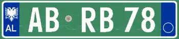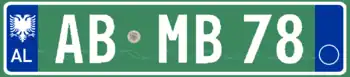 A new format similar to the post-1994 Italian and post-2009 French plate designs has been introduced since 16 February 2011.[1] The plates start with a blue strip at the left with 'AL' and redesigned double-headed eagle in white, 2 serial letters, security hologram, 3 digits, 2 serial letters on a rectangular white background, and end on the right with a blue strip that's supposed to show year of registration and regional code in white on. It has been observed that the last two identification elements are de facto not included while the font is more emphasized than the post-2002 one.[2] Plates of all vehicles would experience a similar change.[3] Critics claim that the color of the double headed eagle and strip is not representative of red and black colors of the Albanian flag.