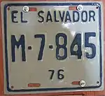 El Salvador requires its residents to register their motor vehicles and display vehicle registration plates.[1] Current plates are North American standard 6 × 12 inches (152 × 300 mm).[2] The new design started its use during 2011. In the background of the plate, you can find the flag of El Salvador. [3]