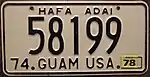 1974–77 Embossed black on reflective white with border line; "74" at bottom left Hafa Adai 12-345 1 to approximately 57-500