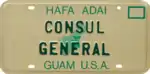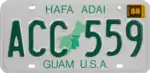 1986–93 Embossed dark green on reflective white; graphic in center featuring pale green map and two green latte stones Hafa Adai ABC 123 AAA 001 to approximately AFN 999