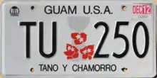 February 27, 2009[3] – present Embossed black on reflective white; graphic in center featuring gray latte stone and three red bougainvillea flowers Tano Y Chamorro Coded by municipality: