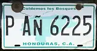Honduran license plates are white and feature an outline of the map of Honduras in a variety of colors according to the class of vehicle registered. All license plates bear the slogan "Cuidemos los Bosques" along the top, ("Take Care of the Forests" in English) and "Honduras, C.A." along the bottom. They are the same size as North American license plates, 6 by 12 inches.[1]