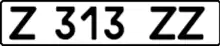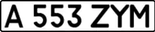 This format of Vehicle registration plates of Kazakhstan used black letters on a white background. Each registration plate consisted of a single letter identifying the area and three digits and two letters identifying the non-individual car (for example: A 001 AA) or of a single letter identifying the area and three digits and three letters identifying the individual car (for example: A 585 CUO)