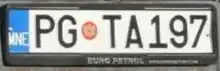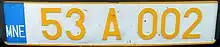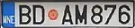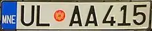 The plate is in following layout: to the left, a blue-colored field contains Montenegro's international automobile code (MNE); continuing in white background, the two-letter code of the municipality where the vehicle was registered in, then the coat-of-arms of Montenegro following by the registration code, which generally consists of two letters followed by three numbers. However, it is possible to pay for customized plates with any letter-number combination.