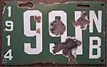 1914 | White serial on green porcelain plate; vertical "1914" and "NB" at left and right respectively | none | 1234 | 701 to approximately 2100 | |