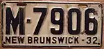 1937 | Embossed white serial on black plate; "NEW BRUNSWICK - 37" at bottom | none | 12-345 | 1-000 to approximately 34-000 | |