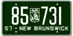 1955 | Embossed white serial on green plate with border line; embossed provincial shield used as separator; "55 – NEW BRUNSWICK" at bottom | none | 12-345 | 1-000 to approximately 79-000 | |