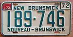 1972–74 | Embossed green serial on reflective white plate; border lines around plate and around top corners; "NEW BRUNSWICK" and "NOUVEAU-BRUNSWICK" centred at top and bottom respectively; "72" at top right | none | 123-456 | 1-000 to approximately 270-000 | |