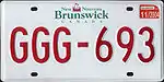 1991-2003 | Embossed red serial on reflective white plate; screened provincial wordmark (red galley graphic with "New" and "Nouveau" to the left and "Brunswick" to the right, all in green) centred at top | none | TAB 123 | ||