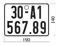 Motorcycles over 50cc receive two-line plates of the 12-A3/456.78 format, which replaced the previous 12-A3/4567 format, with black lettering on white backgrounds.
