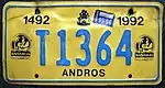 1992-1996 | blue on yellow | 1492 FIRST LANDFALL 1992 | T1234 | anniversary of Christopher Columbus's arrival in the Americas on October 12, 1492 (truck plate) | |