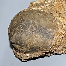 These snails had a heavy, oval shell reaching a length of about 30 millimetres (1.2 in). The earliest regular windings are visible at the top of the shell.