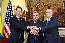 Guaidó traveled from Cúcuta to Bogotá for a 24 February meeting with US Vice President Mike Pence,[185][186] and a 25 February meeting of the Lima Group.[187][188] The group urged the International Criminal Court to pursue charges of crimes against humanity for the Maduro administration's use of violence against civilians and blockade of humanitarian aid.[189][190]