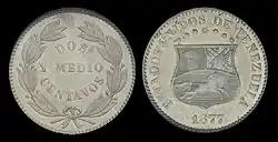 Given the inability of previous governments to order enough coins from the mints in Paris, London, and United States to meet demand, many foreign and demonetised coins circulated that were prone to perforations, scratches, chipping, or smoothing beyond recognition.[1] The monetary law of 11 May 1871 replaced the peso (the only one of the coins in circulation that was legal tender) with the venezolano at par. Coins were minted by several banks including la Compañía de Crédito (lit. The Credit Company) and Estado de Guayana (lit. State of Guiana) following a pattern of copper, nickel, silver and gold.