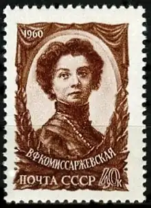 Vera Fyodorovna Komissarzhevskaya (Russian: Ве́ра Фёдоровна Комиссарже́вская; 8 November 1864 – 23 February 1910) was one of the most celebrated actresses and theatre managers of the late Russian Empire. She made her professional debut in 1893, after having acted as an amateur at Constantin Stanislavsky's Society of Art and Literature. She is probably best known today for originating the role of Nina in the ill-fated premiere of Anton Chekhov's The Seagull, at the Alexandrinsky Theatre in Saint Petersburg in 1896. Though the production was deemed an utter failure, Komissarzhevskaya's performance was highly praised.[1]