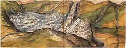 The illustration portrays the Rofen Ice Lake during modern times and is the earliest-known depiction of an alpine glacier. The lake was formed in July of 1601 during an excursion ordered by Tyrolean authorities to prevent damage to the Ötztal and Inntal regions. The visual accurately depicts the lake's water level at the time, which was 2260 meters. The lake was 1.7 × 0.4 kilometers in length and had a capacity of eleven million cubic meters. Although the graphic portrays the landscape somewhat fancifully, it accurately captures details such as icebergs floating on the lake.[7]