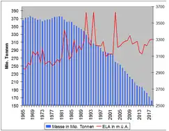 The diagrams on the right demonstrate the data collected by the Commission for Glaciology of the BAdW since 1965 on the growth of the Vernagtferner glacier. The upper diagram shows the glacier's area, with the ablation and accumulation areas (nutrient and supply areas) displayed in different colors. The lower graphic presents the overall mass evolution. The Equilibrium Line Altitude (ELA), which marks the altitude where the mass balance of the year is balanced, is also shown to be rising. This line divides the accumulating area and the ablation area.