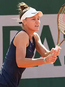 She entered the French Open as one of the dark horses,[65][66] and navigated a tough first-round win against former semifinalist Amanda Anisimova, in straight sets.[67] However, she was stunned by Kateřina Siniaková in the second round, despite leading 5–1 in the final set.[68]