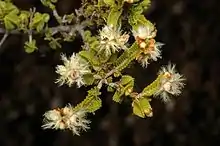 The flowers are faintly scented and arranged in small groups in leaf axils on stalks 0.5–1.0 mm (0.02–0.04 in) long. The floral cup is shaped like half a sphere, 1.0–1.6 mm (0.04–0.06 in) long, glabrous and smooth. The sepals are white to cream-coloured, 4–5 mm (0.16–0.20 in) long, with 2 or more hairy lobes. The petals are cream-coloured to white, broadly egg-shaped, 2–3.5 mm (0.08–0.1 in) long, joined for about 1 mm (0.04 in) of that length and have irregular teeth around their top edge. The style is 3.5–4.5 mm (0.1–0.2 in) long, straight with hairs just below its tip. Flowering time is mainly from July to November.[2][3][4]