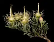 The flowers and arranged in rounded groups near the ends of the branches, each flower on a stalk 2–5 mm (0.08–0.2 in) long and smelling faintly of mice. The floral cup is hemispherical and 1–1.5 mm (0.04–0.06 in) long. The sepals are green and reddish, 3–4 mm (0.1–0.2 in) long, deeply divided into thin filaments, partly whitish and partly brownish. The petals are cream to yellowish, egg-shaped, about 2 mm (0.08 in) long, and fade to reddish or brown. The style is 6–7 mm (0.24–0.28 in) long, straight and hairy near the tip. Flowering time is from October to January.[2]