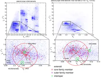The Vesta family (adj. Vestian; FIN: 401) is a family of asteroids. The cratering family is located in the inner asteroid belt in the vicinity of its namesake and principal body, 4 Vesta. It is one of the largest asteroid families with more than 15,000 known members and consists of mostly bright V-type asteroids, so-called "vestoids".