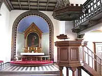 Covered by a wooden ceiling, galleries line the north and south sides of the nave. The pulpit and the altarpiece depicting Jesus in the Garden of Gethsemane date from 1885 when the new church was consecrated.[2]