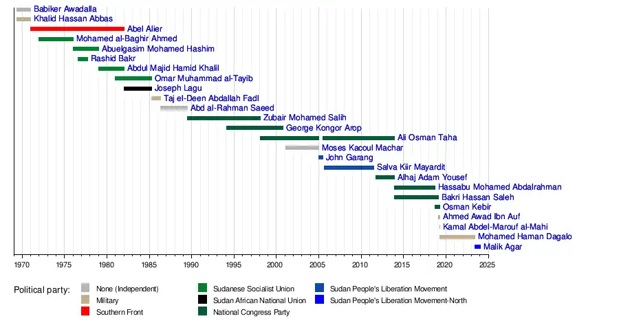 Deputy Chairman of the NRCC Babiker Awadalla May 1969 1971 2 years Independent Gaafar Nimeiry [2]